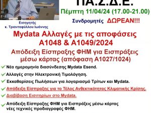 11/04/24 Mydata Αλλαγές με τις αποφάσεις Α1048 & Α1049/2024-Απόδειξη Είσπραξης ΦΗΜ-Εισπράξεις μέσω κάρτας με τον κ. Ιωάννη Τριανταφύλλου