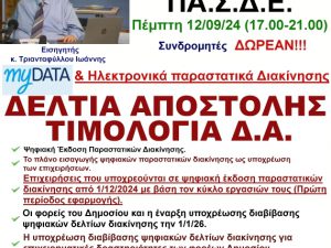 12-09-2024 Ηλεκτρονικά παραστατικά Διακίνησης ( ΔΕΛΤΙΑ ΑΠΟΣΤΟΛΗΣ – ΤΙΜΟΛΟΓΙΑ Δ.Α.) με τον κ. Ιωάννη Τριανταφύλλου