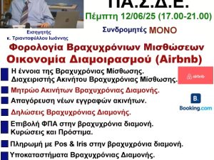 12-06-2025 Η Φορολογία των Βραχυχρόνιων Μισθώσεων στο πλαίσιο Οικονομίας Διαμοιρασμού (Airbnb) με τον κ. Ιωάννη Τριανταφύλλου