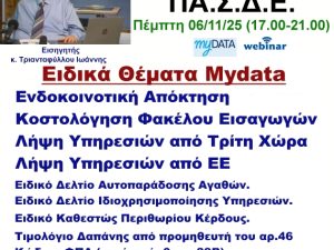 06-11-2025 Ειδικές Περιπτώσεις & Θέματα MyData – ΕΙΣΑΓΩΓΕΣ ΕΝΔΟΚΟΙΝΟΤΙΚΕΣ – Φάκελος Εισαγωγών – Αυτοπαράδοση με τον κ. Ιωάννη Τριανταφύλλου