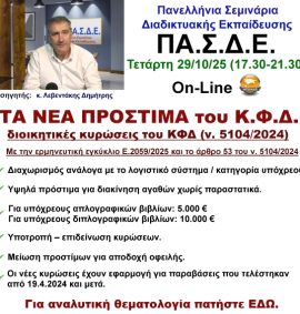 29/10/2025 Τα Νέα Πρόστιμα του Κ.Φ.Δ. με την ερμηνευτική εγκύκλιο Ε.2059/2025 και το άρθρο 53 του ν. 5104/2024 με τον κ. Δημήτρη Λεβεντάκη