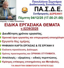 04-12-2025 Επίκαιρα Εργασιακά Θέματα με τον ν. 5239/2025 ΓΙΑ ΨΗΦΙΑΚΗ ΚΑΡΤΑ ΕΡΓΑΣΙΑΣ – ΠΣ ΕΡΓΑΝΗ – Διευθέτηση χρόνου εργασίας με τον κ. Λιάζο Παλαιολόγο