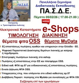 05-02-2026 Ηλεκτρονικά καταστήματα eshops. Θέματα Τιμολόγησης Διακίνησης OSS MyData με τον κ. Ιωάννη Τριανταφύλλου